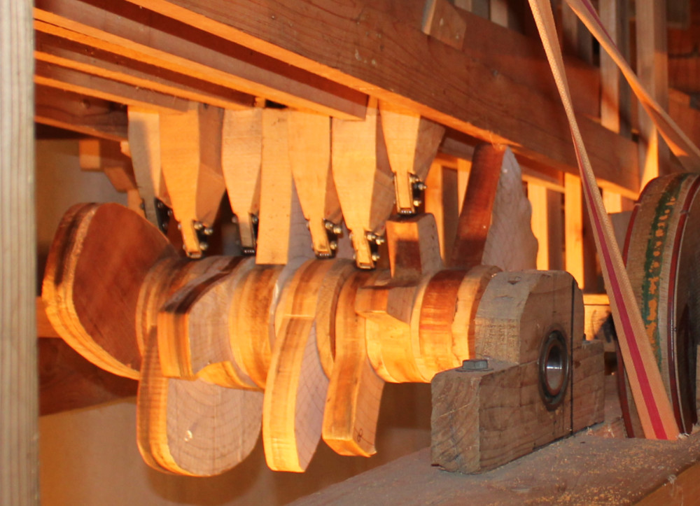動力源となるのは、水路を流れる水を受けて回転する水車ただ一つ。 その回転から、多くの人形をそれぞれ異なる動き、異なるタイミングで動かすために様々なからくりの機構が用いられています。